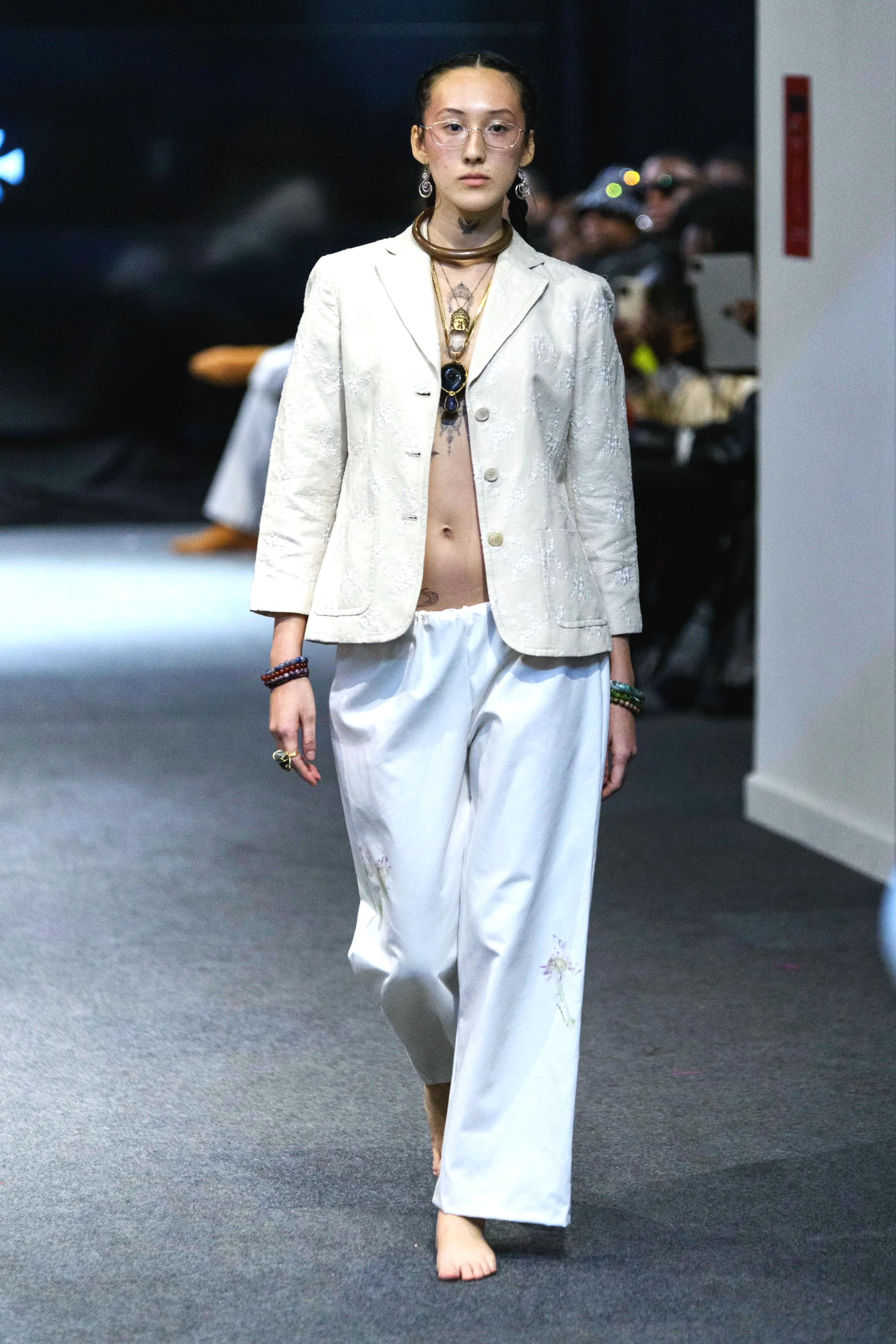 Moscow-based luxury house SOLANGEL delivered crystal-drenched eveningwear defined by architectural precision and unapologetic glamour. Sculpted silhouettes, statement red suiting, and proprietary embellishment techniques positioned the brand firmly within global fashion capitals. The presentation reflected disciplined craftsmanship layered with high-impact femininity.