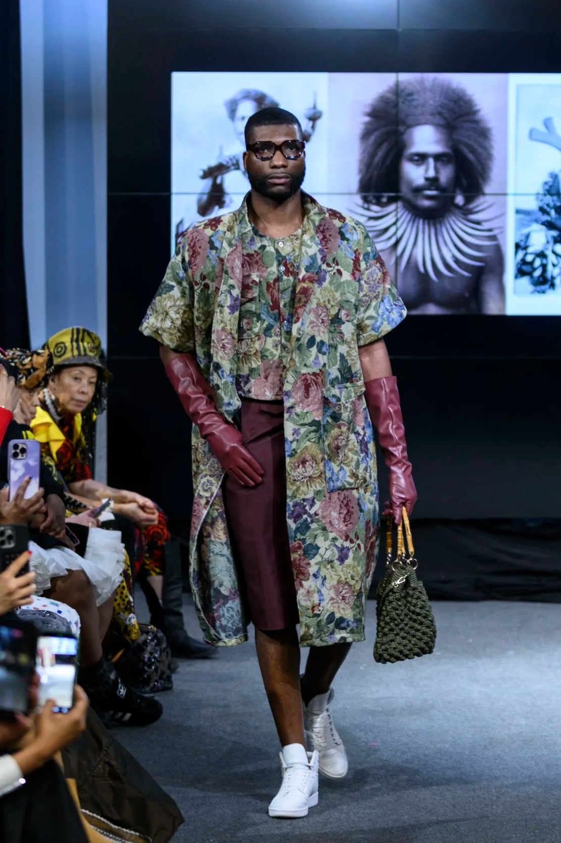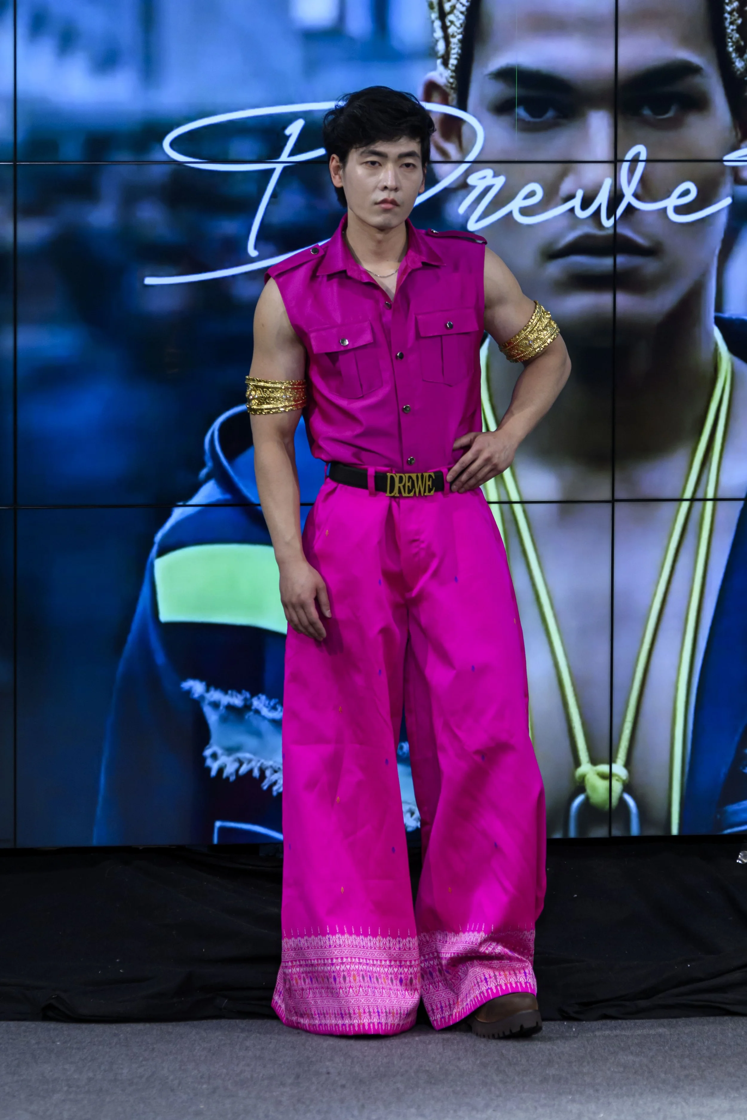 Drewe Taylor Designs presented Kingdom Rising, merging Khmer heritage with saturated color and structured streetwear. Electric pink, neon orange, and symbolic gold accents reframed masculinity through cultural pride and fearless individuality. Tailoring moved fluidly between royal influence and urban energy.